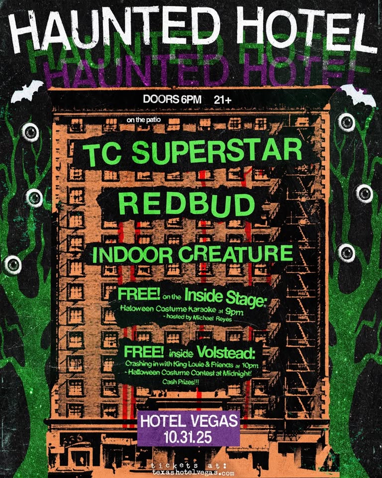 This Halloween night, Hotel Vegas transforms into HAUNTED HOTEL, a full-compound takeover with TC Superstar, Redbud, and Indoor Creature on the Patio Stage.